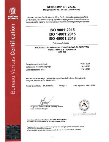 Necks IMP wdrożył i certyfikował Zintegrowane Systemy Zarządzania dla procesów produkcji elementów konstrukcji stalowych: